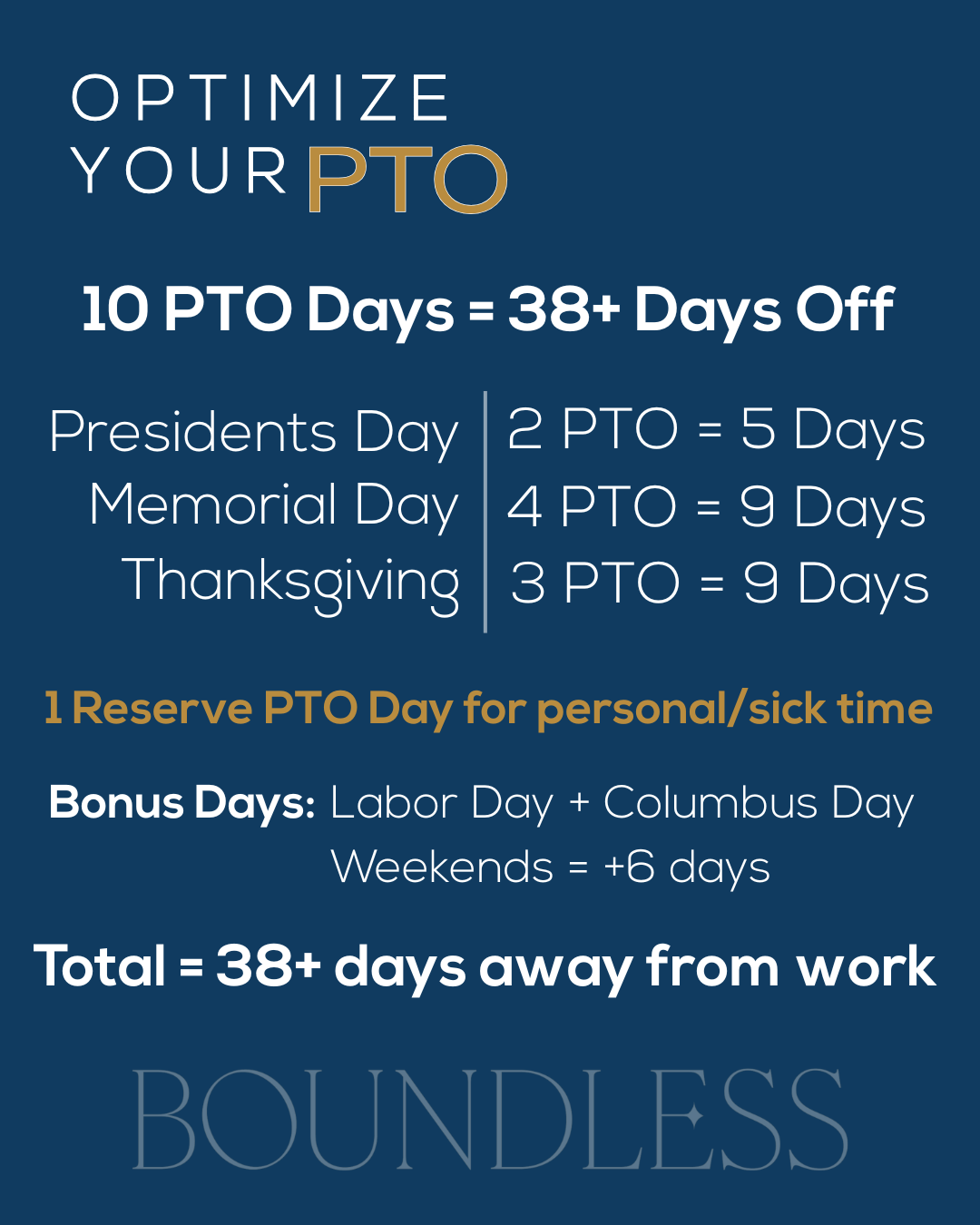 Why It Works:Thanksgiving is the highest-value holiday (2 federal days + 3 PTO = 9 days off)